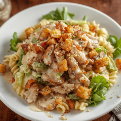 8. Assemble the salad by adding the diced chicken, romaine lettuce, cooked pasta, and dressing to a bowl. Toss together and enjoy!